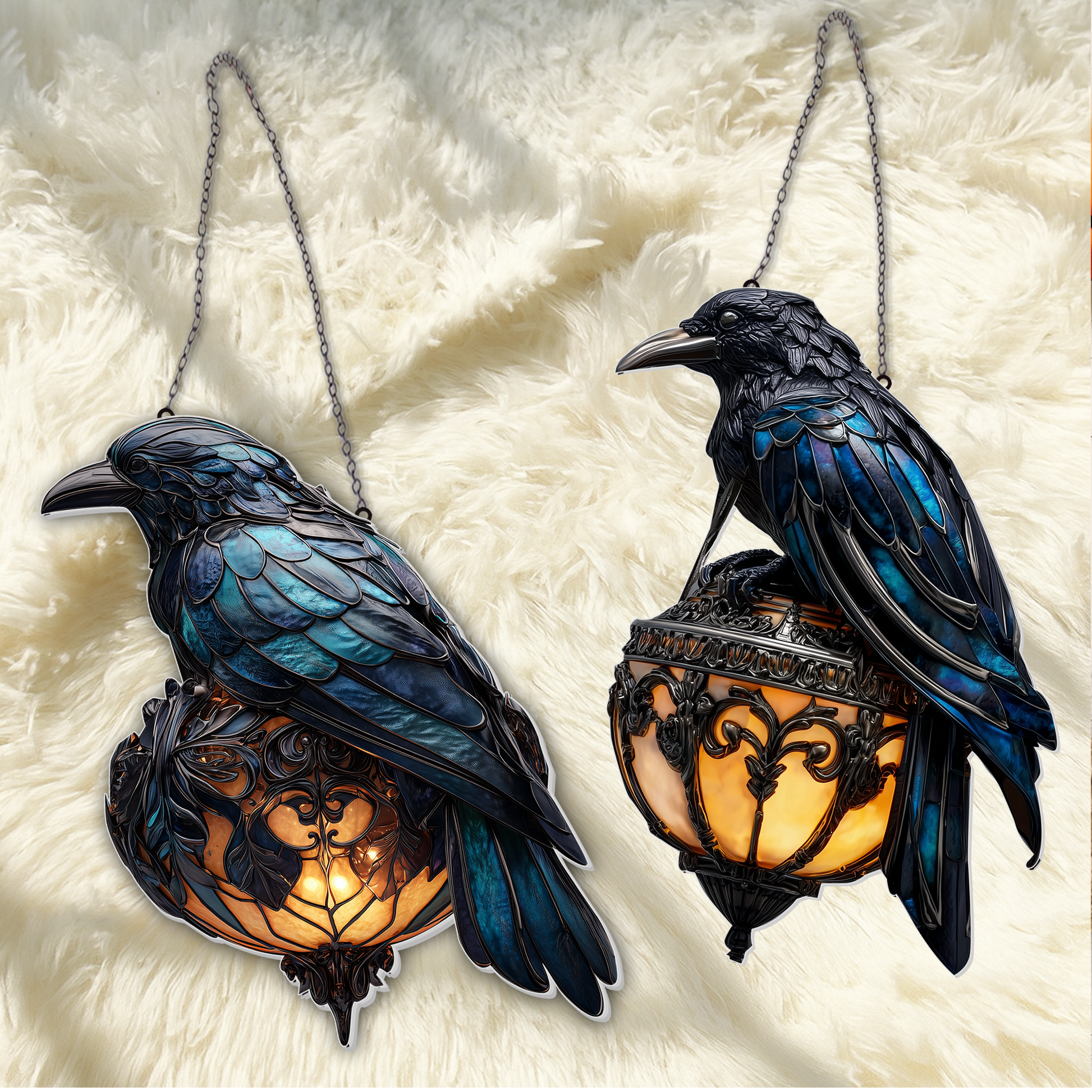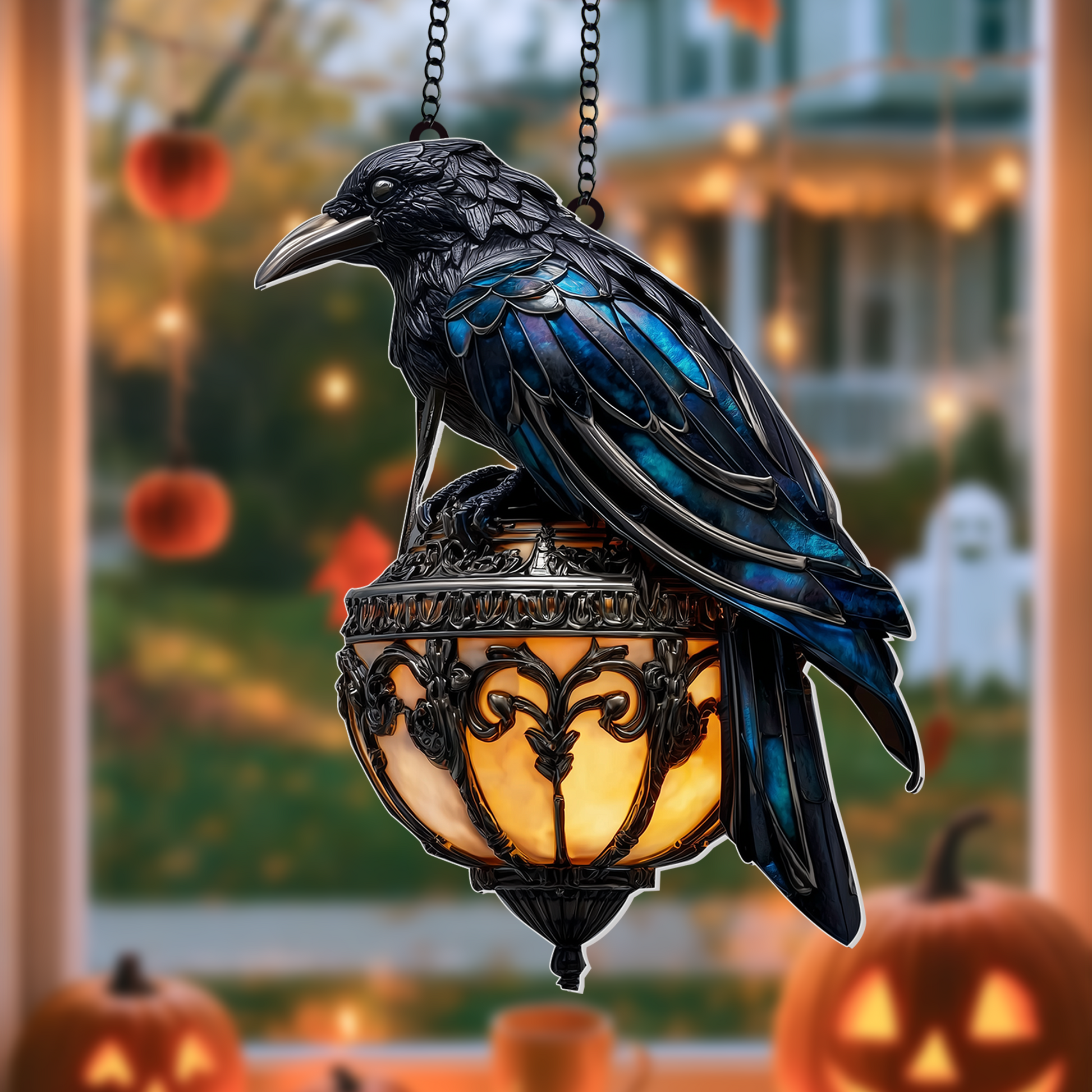 Embrace the mystery and elegance of nature with our Halloween Raven Lantern Suncatcher — a captivating piece of art that brings beauty, symbolism, and a touch of the wild into your home. This stunning suncatcher features a meticulously designed raven, perched gracefully on a branch, its sleek acrylic feathers catching and reflecting light with every ray of sunshine.